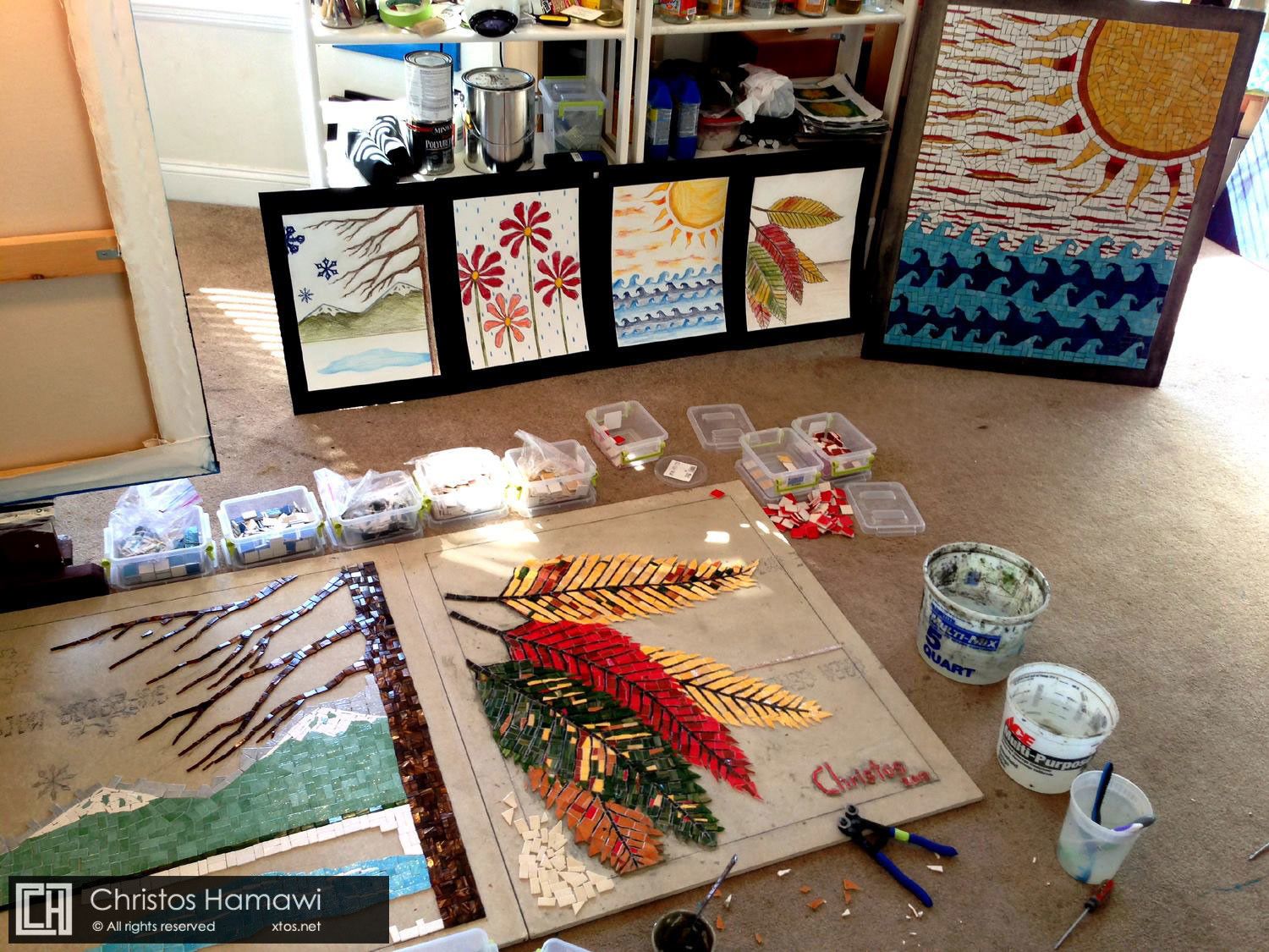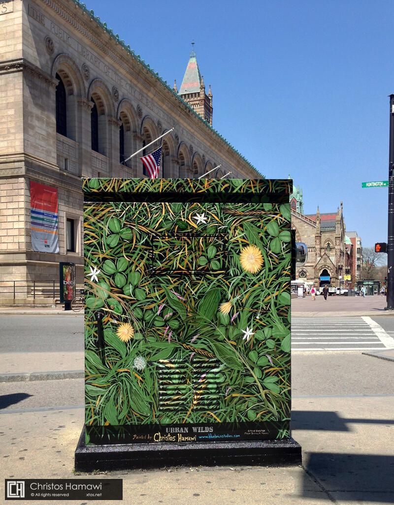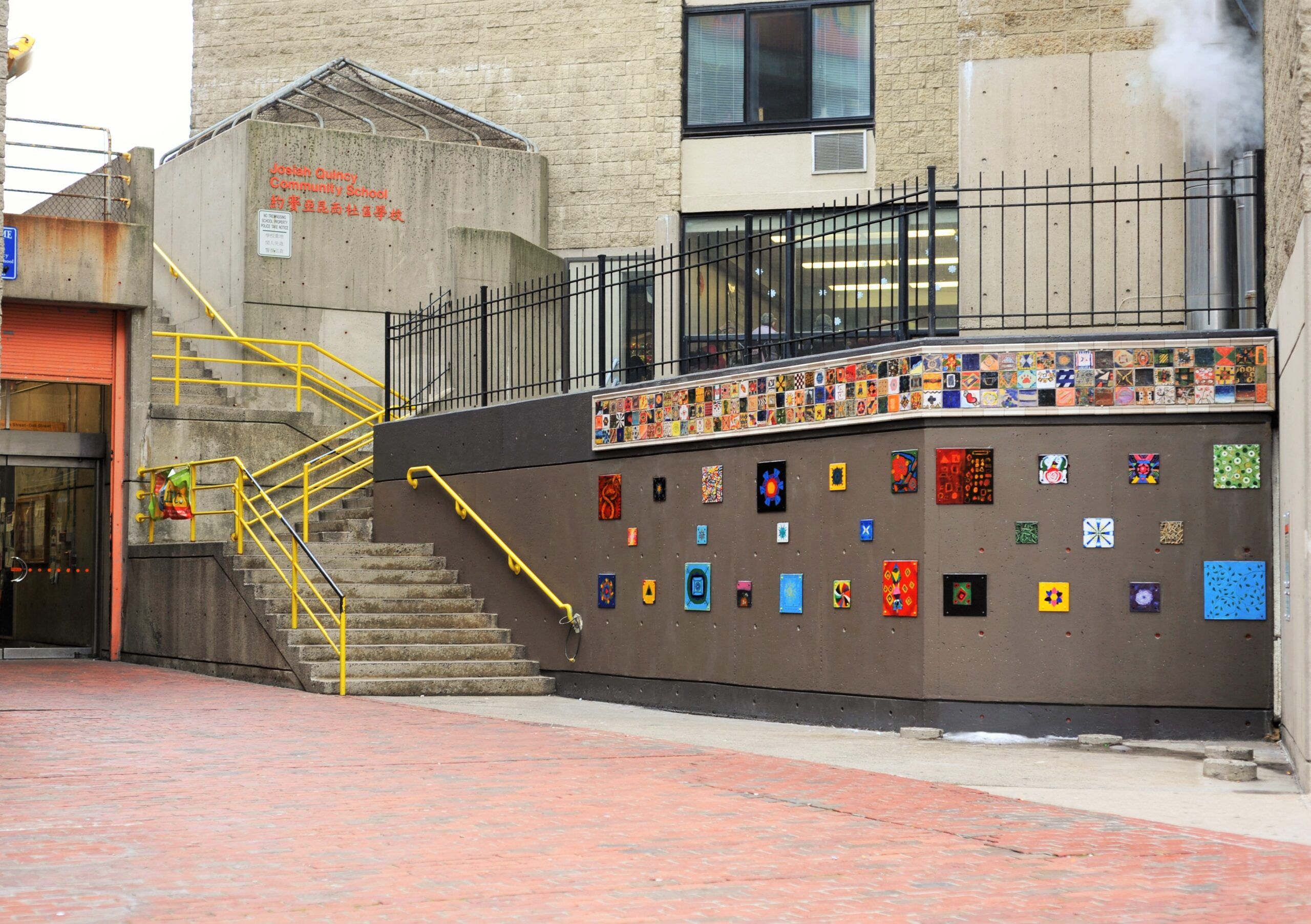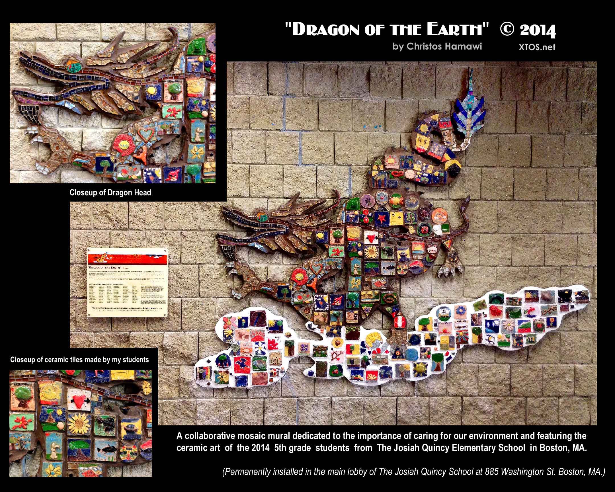 A mosaic mural comprised of 60 unique hand-cut glass tile panels and designed to resemble a stitched fabric patchwork quilt. The mosaic "fabric" represents the stitching together of many different aspects of our community into one. While diversity is a key theme of the mural, the core message is unity. Inspired by the vibrancy, geometry, and diversity found in both African and Native American textiles, Christos began designing the mural one panel at a time. He then constructed several of the more complex panels in his studio and collaborated on the construction of the remaining panels together with over 150 students from the Josiah Quincy Elementary School.