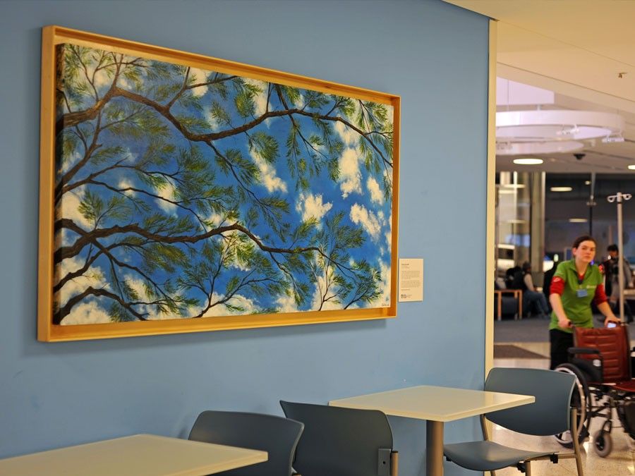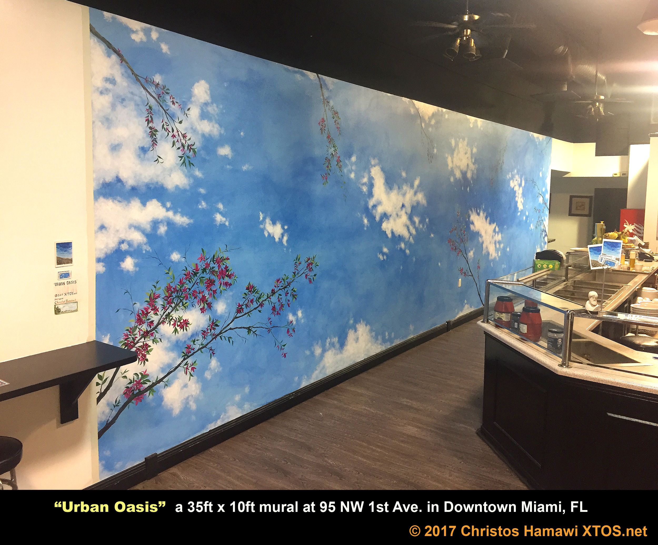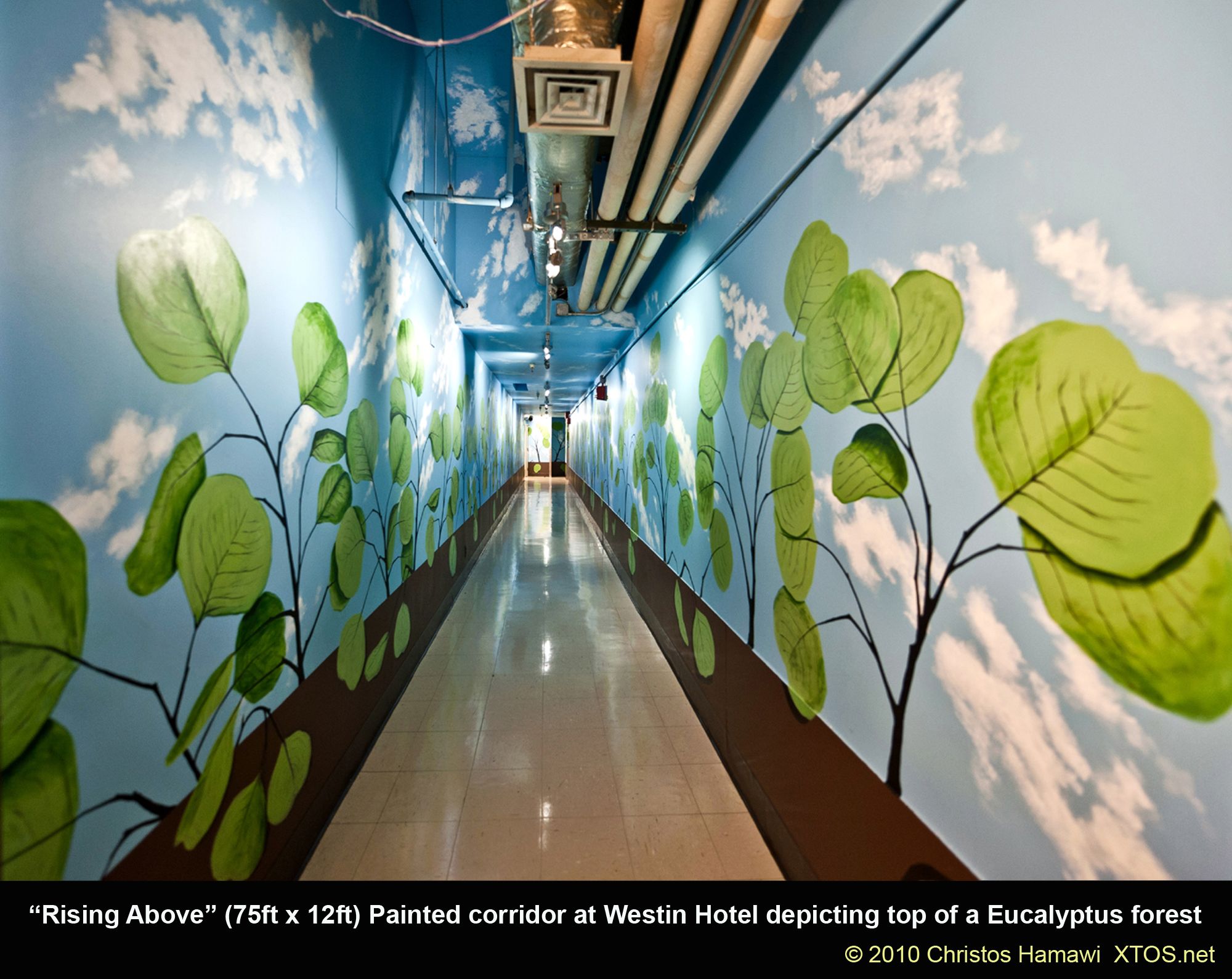 This mural depicting an extreme close up view of eucalyptus leaves against a giant blue sky was commissioned by the Copley Westin to brighten up what was once a dark hallway within the corporate wing of the hotel. The hallway is approximately 75ft long and 9ft to 15ft high.
